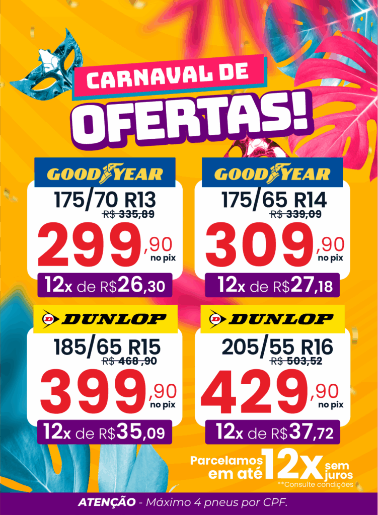 Promoção não acumulativa e atrelada a disponibilidade de estoque. Pneus Promocionais, montados em loja, vendidos à vista e à base de troca, em respeito a resolução nº 416, de 30 de setembro de 2009. Máximo 4 pneus por CPF. Todas as imagens são meramente ilustrativas. Não executamos serviços em carro com à originalidade adulterada. Por se tratar de uma promoção relâmpago, a Palermo Pneus reserva no direito de interromper a promoção sem prévio aviso. **Parcelamos até 12x, consulte condições em loja.
